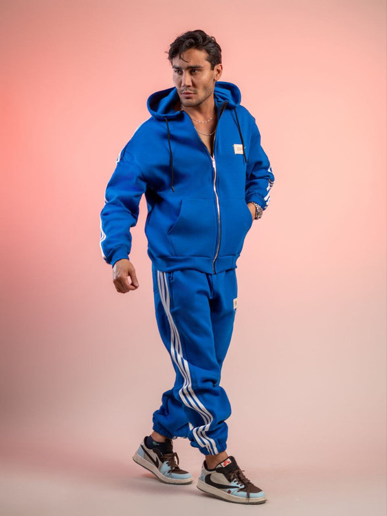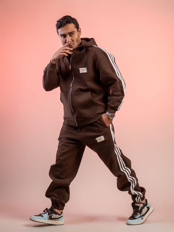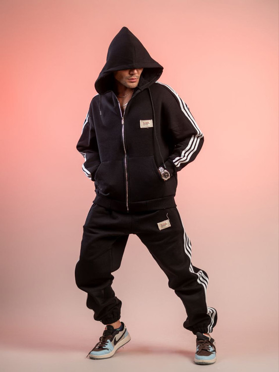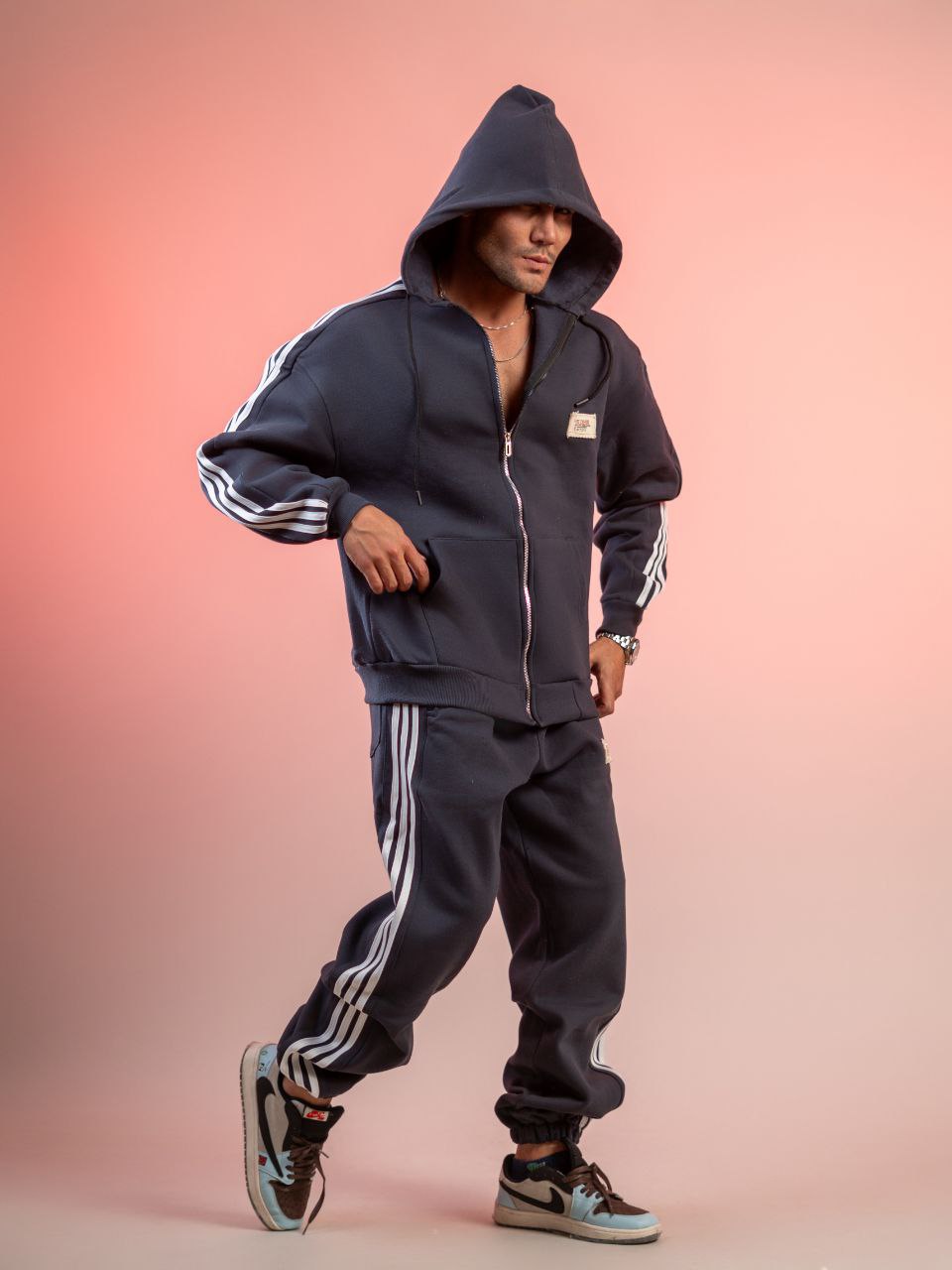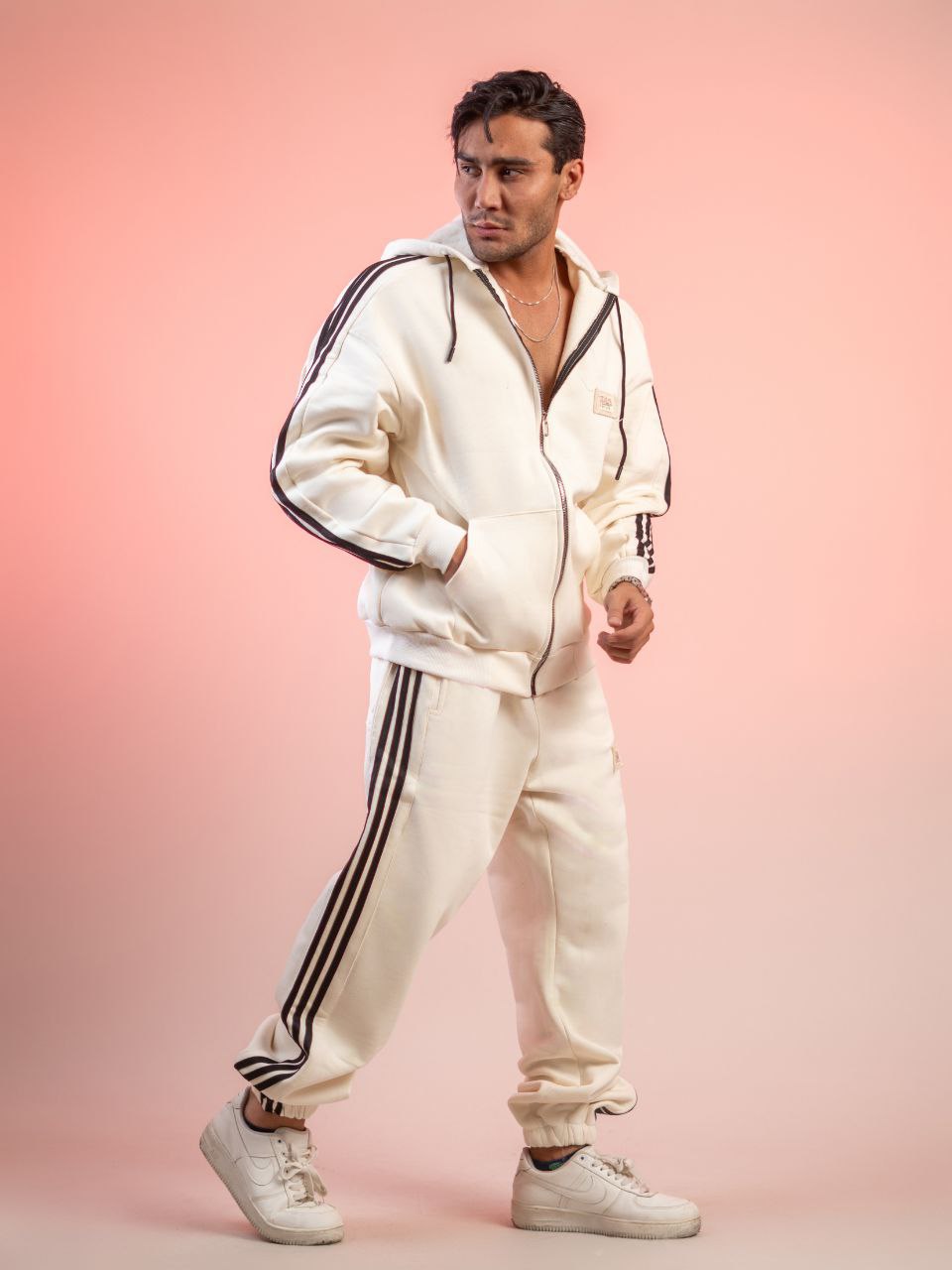 سویشرت دارای **فرم باکسی(تنخور مدرن)** بوده و همراه با **کلاه و زیپ سراسری** طراحی شده است. شلوار هم با **کمر کشی بنددار** و **پای جمع (مدل جاگر)** دوخته شده تا در عین راحتی، ظاهری مرتب و شیک ایجاد کند.